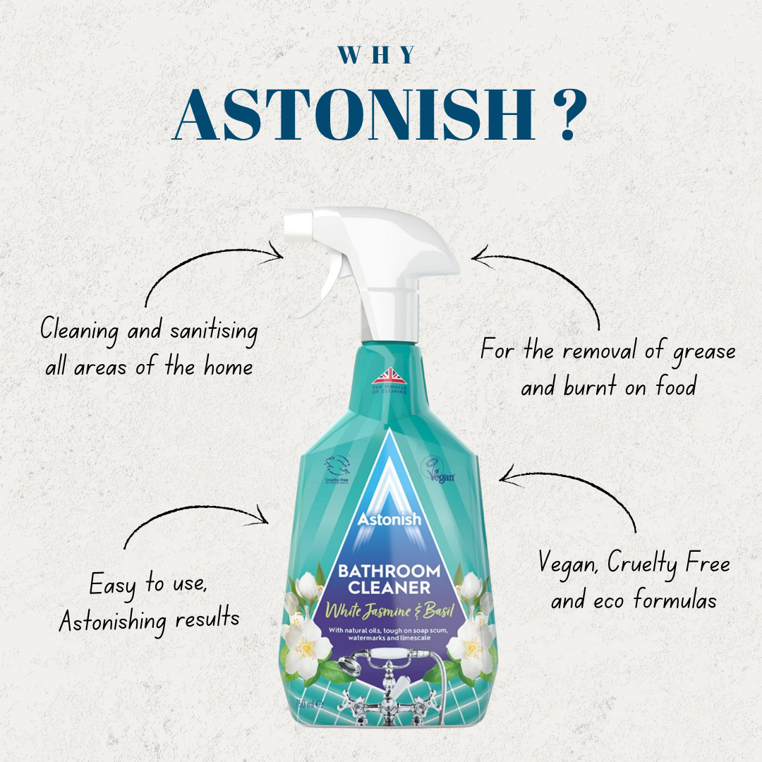 Keep your bathroom sparkling clean with the Astonish Bathroom Cleaner Spray. Specially formulated to tackle tough bathroom grime, this powerful cleaner effectively removes limescale, soap scum, and watermarks, restoring shine to surfaces with ease.
