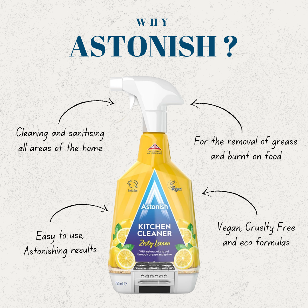 Keep your kitchen fresh, clean, and hygienic with the Astonish Kitchen Cleaner Spray. Specially developed to tackle everyday kitchen mess, this effective formula is enriched with natural oils to help cut through stubborn grease, grime, and food residue with ease.